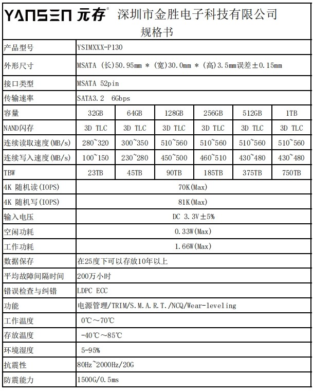 | YSIM128-P130 | 3D TLC | 128GB | 510~560MB/S | 450~500MB/S |
