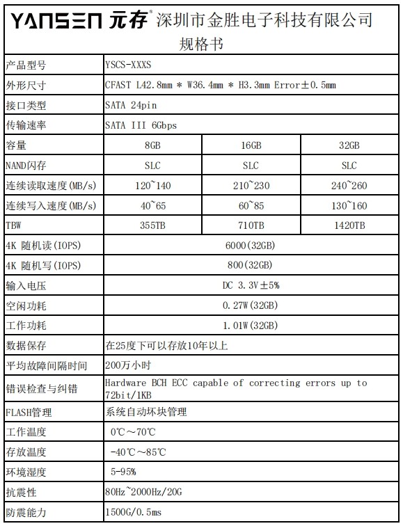 | YSCS-32S | SLC | 32GB | 240~260MB/S | 130~160MB/S | 1420TB |
