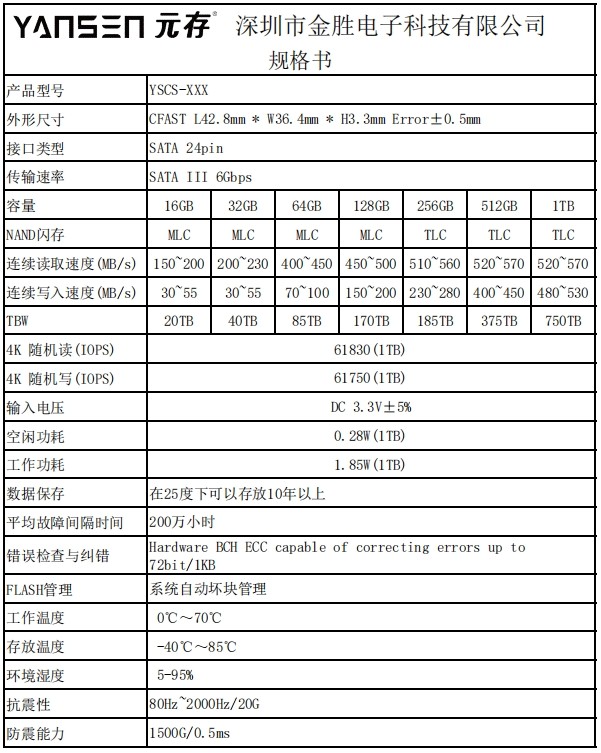 | YSCS-32 | MLC | 32GB | 200~230MB/S | 30~55MB/S | 40TB |