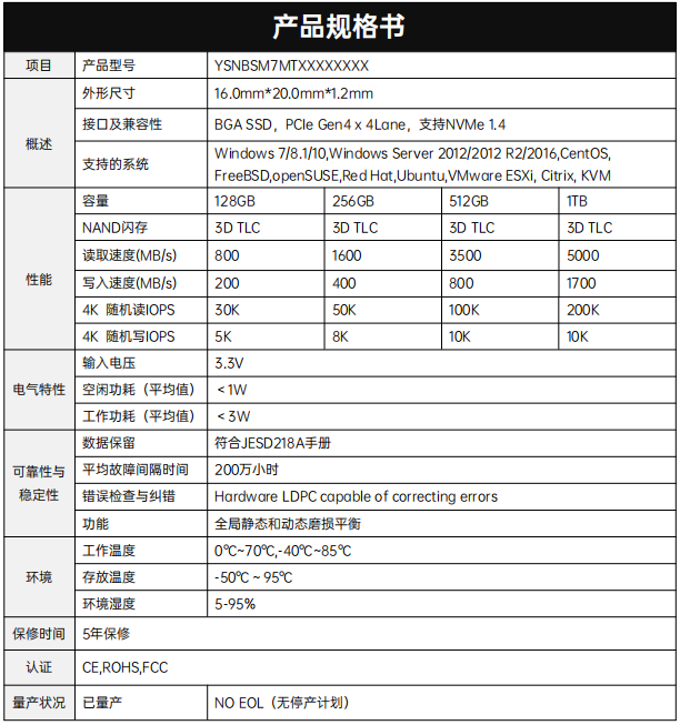 接口:BGA SSD (NVMe 1.4)